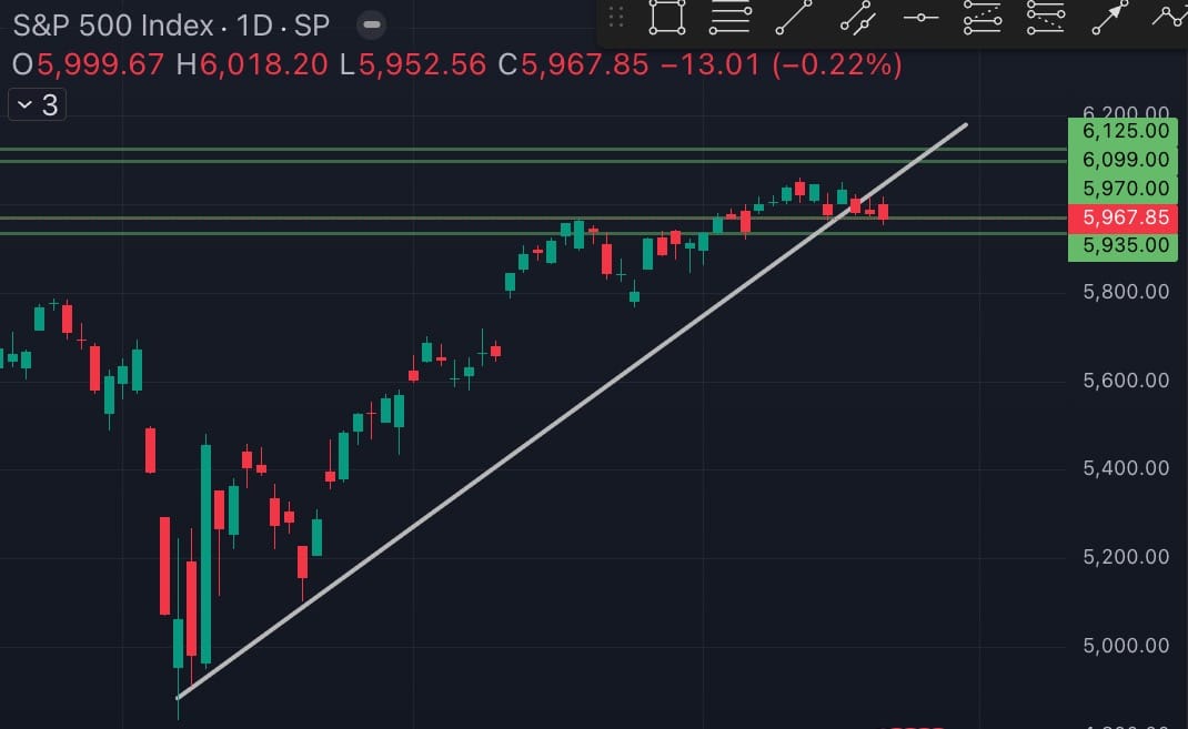Trendline: Rising support from April lows now intersects 5985, adding confluence.